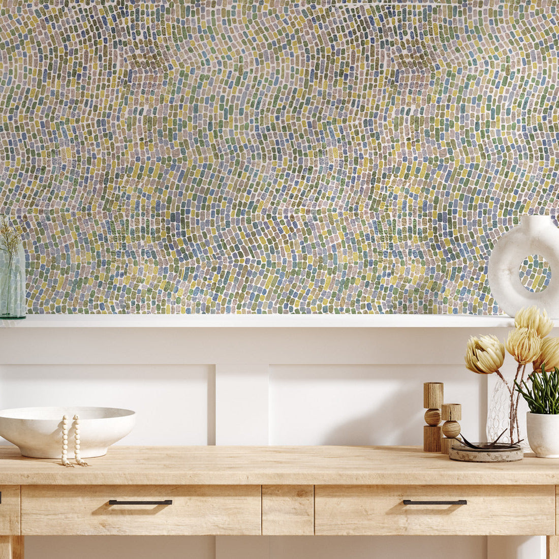 Porta il fascino delle antiche tessere musive sulle tue pareti con il murale "Vetro di Mare". Un design ispirato ai riflessi del vetro levigato dall’acqua, con sfumature calde e armoniose, perfetto per ambienti eleganti e accoglienti.